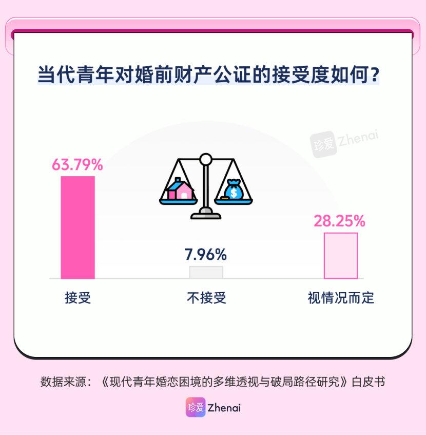 此前,我国民政部直属的、唯一一所本科层次高等学校民政职业大学与珍爱网联合发布的《现代青年婚恋困境的多维透视与破局路径研究》白皮书显示,超半数(63.79%)的受访者能够接受进行婚前财产公证,认为这是一种理性且有助于保障双方权益的方式;28.25%的受访者表示可视情况而定,仅有7.96%的人明确表示无法接受。这说明,越来越多人正以更务实的态度看待婚姻,财产公证逐渐被理解为减少矛盾、保障感情稳定的一种选择,而非感情不牢固的表现。